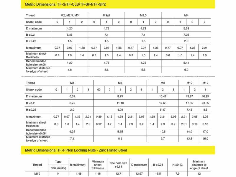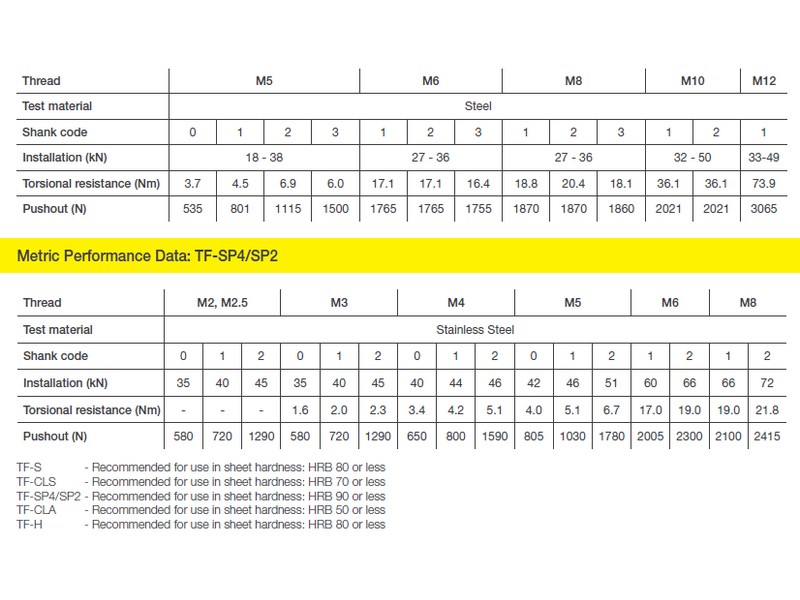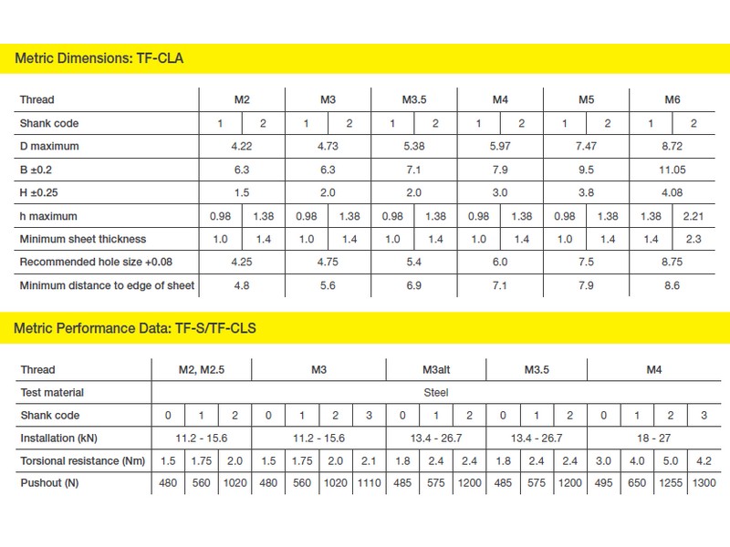 • Materials: Steel (TF-S), Aluminium (TF-CLA), Stainless Steel (TF-CLS), A286 Stainless Steel (TF-SP2), 400series Stainless Steel (TF-SP4)