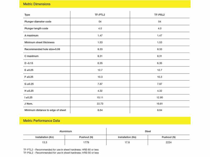 • perno di posizionamento imperdibile nella lamiera sottile. Disponibile nelle versioni con blocco (TF-PTL2) e senza blocco (TF-PSL2)