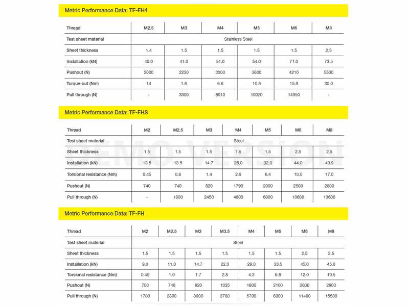 - Materiali: acciaio (TF-FH), alluminio (TF-FHA), acciaio inossidabile (TF-FHS), acciaio inossidabile serie 400 (TF-FH4)
